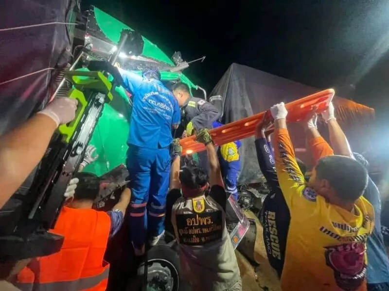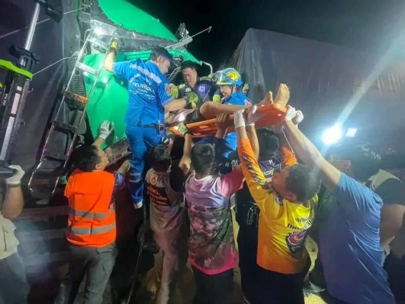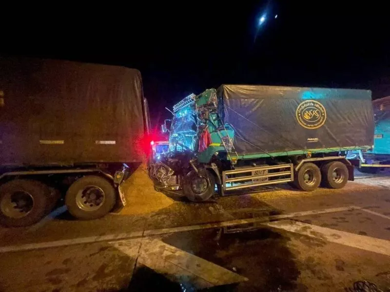 ที่เกิดเหตุพบรถบรรทุกพ่วง 22 ล้อทะเบียน 70-4958 พย บรรทุกข้าวมาเต็มคันรถ ชนท้ายพ่วง 22 ทะเบียน 70-4957 พย.คันที่กำลังวิ่งออกจากแยกไฟแดงจนสภาพด้านหน้ารถเสียหายยุบ กระจกแตกข้าวเปลียกตกมากองเต็มถนนและมีผู้ได้รับบาดเจ็บ ชาย 1 ราย ติดภายในรถ ชื่อ นาย ภาคภูมิ รักคณะ อายุ 28 ปี 173 ม.12 ต.ปล้อง อ.เทิง จ.เชียงราย ชุดกู้ภัยใช้เครื่องตัดถ่างนำตัวออกมาจากรถ เบื้องต้นมีอาการปวดบริเวณขา และมีแผลถลอกตามร่างกายกู้ภัยนำส่งโรงพยาบาลแม่ใจ