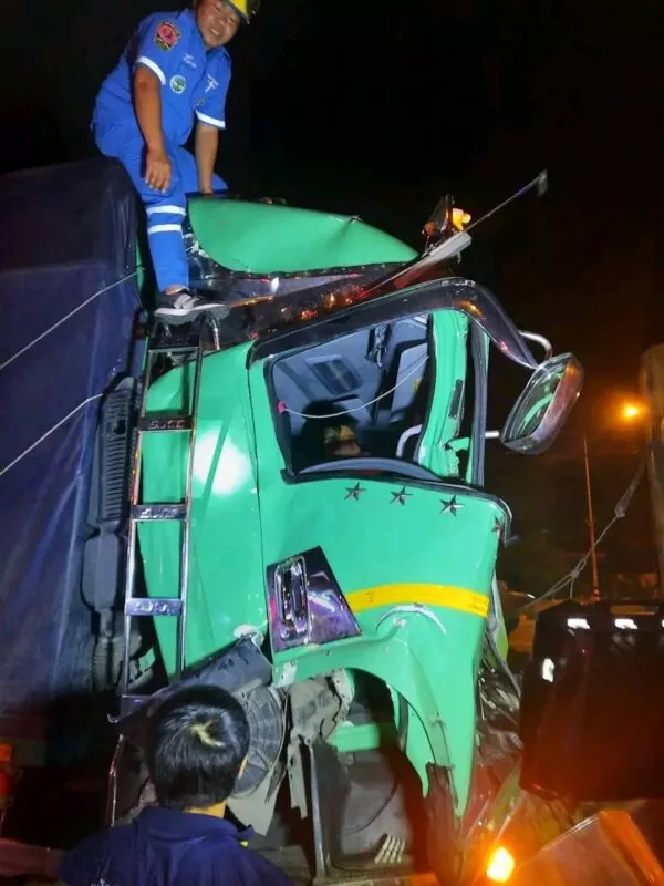 ที่เกิดเหตุพบรถบรรทุกพ่วง 22 ล้อทะเบียน 70-4958 พย บรรทุกข้าวมาเต็มคันรถ ชนท้ายพ่วง 22 ทะเบียน 70-4957 พย.คันที่กำลังวิ่งออกจากแยกไฟแดงจนสภาพด้านหน้ารถเสียหายยุบ กระจกแตกข้าวเปลียกตกมากองเต็มถนนและมีผู้ได้รับบาดเจ็บ ชาย 1 ราย ติดภายในรถ ชื่อ นาย ภาคภูมิ รักคณะ อายุ 28 ปี 173 ม.12 ต.ปล้อง อ.เทิง จ.เชียงราย ชุดกู้ภัยใช้เครื่องตัดถ่างนำตัวออกมาจากรถ เบื้องต้นมีอาการปวดบริเวณขา และมีแผลถลอกตามร่างกายกู้ภัยนำส่งโรงพยาบาลแม่ใจ