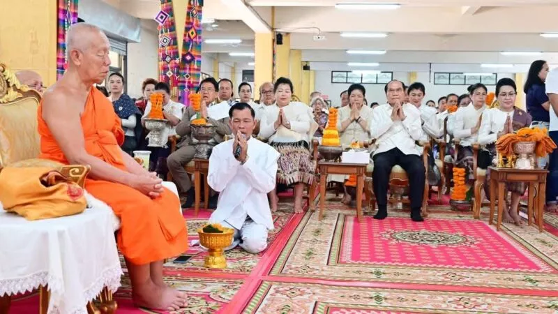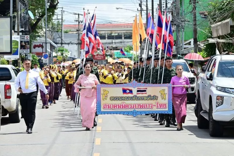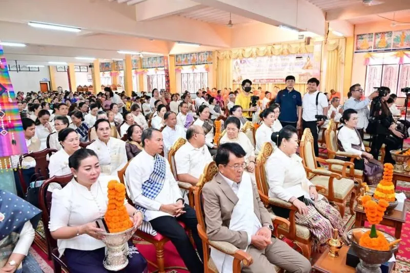 เมื่อเวลา 11.00 น. วันที่ 25 พ.ค.2568 วัดศรีนวล ตำบลในเมือง อ.เมือง จ.ขอนแก่น นายไกรสร กองฉลาด ผวจ.ขอนแก่น พร้อมด้วย นายพันธ์เทพ เสาโกศล รอง ผวจ.ขอนแก่น,นายศิริวัฒน์ พินิจพานิชย์ รอง ผวจ.ขอนแก่น ,นายเข็มชาติ สมใจวงษ์ ประธานกิตติมศักดิ์หอการค้าขอนแก่น นายเกียรติคุณ ชาติประเสริฐ นายกสมาคมไทย-ลาว เพื่อมิตรภาพ นำหัวหน้าส่วนราชการ ผู้นำแงีกรภาครัฐและเอกชน ประชาชนชาว จ.ขอนแก่นร่วมพิธีทอดผ้าป่าสามัคคีสมาคมมิตรภาพลาว-ไทย เพื่อร่วมเฉลิมฉลองเนืองในวันสถาปนาความสัมพันธ์ทางการทูตลาว -ไทย ครบรอบ 75 ปี และวันก่อตั้งสมาคมมิตรภาพลาว-ไทย และให้การต้อนรับ นางเวียงเงิน ไขคำพิทูน ภริยารองนายกรัฐมนตรีสาธารณรัฐประชาธิปไตยประชาชนลาว ,นายหลี บุนค้ำ ประธานสมาคมมิตรภาพลาว – ไทย ,นายสมสัก วิไลทอน กงสุใหญ่ สปป.ลาว ประจำประเทศไทย และคณะ จาก สปป.ลาว ที่มาร่วม ทอดถวายผ้าป่า เพื่อสมทบทุนสร้างอาคารจุฬามณีเจดีย์สถานโรงเรียนประภัสสรวิทยา วัดศรีนวล จ.ขอนแก่น