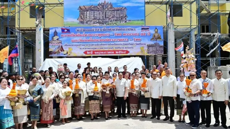 เมื่อเวลา 11.00 น. วันที่ 25 พ.ค.2568 วัดศรีนวล ตำบลในเมือง อ.เมือง จ.ขอนแก่น นายไกรสร กองฉลาด ผวจ.ขอนแก่น พร้อมด้วย นายพันธ์เทพ เสาโกศล รอง ผวจ.ขอนแก่น,นายศิริวัฒน์ พินิจพานิชย์ รอง ผวจ.ขอนแก่น ,นายเข็มชาติ สมใจวงษ์ ประธานกิตติมศักดิ์หอการค้าขอนแก่น นายเกียรติคุณ ชาติประเสริฐ นายกสมาคมไทย-ลาว เพื่อมิตรภาพ นำหัวหน้าส่วนราชการ ผู้นำแงีกรภาครัฐและเอกชน ประชาชนชาว จ.ขอนแก่นร่วมพิธีทอดผ้าป่าสามัคคีสมาคมมิตรภาพลาว-ไทย เพื่อร่วมเฉลิมฉลองเนืองในวันสถาปนาความสัมพันธ์ทางการทูตลาว -ไทย ครบรอบ 75 ปี และวันก่อตั้งสมาคมมิตรภาพลาว-ไทย และให้การต้อนรับ นางเวียงเงิน ไขคำพิทูน ภริยารองนายกรัฐมนตรีสาธารณรัฐประชาธิปไตยประชาชนลาว ,นายหลี บุนค้ำ ประธานสมาคมมิตรภาพลาว – ไทย ,นายสมสัก วิไลทอน กงสุใหญ่ สปป.ลาว ประจำประเทศไทย และคณะ จาก สปป.ลาว ที่มาร่วม ทอดถวายผ้าป่า เพื่อสมทบทุนสร้างอาคารจุฬามณีเจดีย์สถานโรงเรียนประภัสสรวิทยา วัดศรีนวล จ.ขอนแก่น
