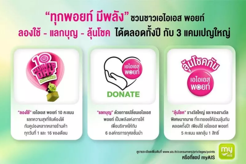 AIS ต่อยอดความสุขผ่าน AIS Points ดันกลยุทธ์ “ทุกพอยท์ มีพลัง” ส่ง 3 แคมเปญใหญ่ “ลองใช้-แลกบุญ-ลุ้นโชค” สร้างความคุ้มค่าให้ทุกการใช้คะแนนตลอดทั้งปี