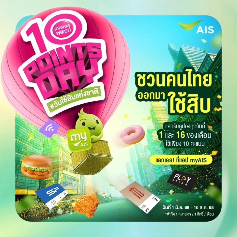 · ลองใช้ – เปิดโอกาสให้ลูกค้าเริ่มต้นใช้ AIS Points ได้ง่ายๆ ผ่านกิจกรรม “10 Points Day – วันใช้สิบแห่งชาติ” ทุกวันที่ 1 และ 16 ของเดือน กับสิทธิพิเศษจากร้านค้าชั้นนำ ไม่ว่าจะเป็นคูปองอาหาร ขนม เครื่องดื่ม ตั๋วหนัง หรืออินเทอร์เน็ต เพียงใช้แค่ 10 คะแนน ก็สามารถแลกรับได้ทันที เพื่อกระตุ้นการเริ่มต้นใช้งาน ลดการปล่อยให้คะแนนหมดอายุโดยเปล่าประโยชน์ พร้อมเปลี่ยนคะแนนสะสมให้กลายเป็นประสบการณ์ที่จับต้องได้ ตั้งแต่วันนี้ – 16 สิงหาคม 2568 ชวนให้ทุกคนมาใช้ผ่านแคมเปญกระตุ้นแลกพอยท์ วันใช้สิบแห่งชาติ