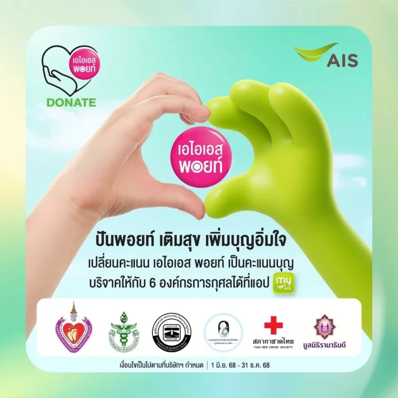 · แลกบุญ – สร้างพลังแห่งการแบ่งปันกับกิจกรรม “ปันพอยท์ เติมสุข เพิ่มบุญอุ่นใจ” ตอบโจทย์กลุ่มลูกค้าที่ต้องการ “ให้” โดยการใช้ AIS Points บริจาคให้กับ 6 องค์กรการกุศลชั้นนำ ได้แก่ มูลนิธิหัวใจแห่งประเทศไทยในพระบรมราชูปถัมภ์ มูลนิธิแพทย์อาสาสมเด็จพระศรีนครินทราบรมราชชนนี มูลนิธิช่วยคนตาบอดแห่งประเทศไทยในพระบรมราชินูปถัมภ์ มูลนิธิโรงพยาบาลเด็กกองทุนอาคารเฉลิมพระเกียรติฯ สภากาชาดไทย และมูลนิธิรามาธิบดีได้โดยตรงผ่านแอป myAIS ตั้งแต่วันนี้ – 31 ธันวาคม 2568 โดยสามารถเลือกบริจาคได้ตั้งแต่ 100, 200 หรือ 300 คะแนนต่อครั้ง