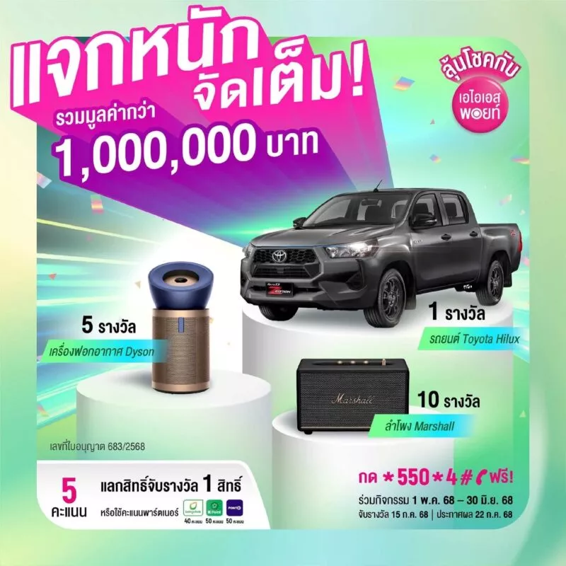 · ลุ้นโชค – สำหรับสายลุ้น AIS ขอชวนมาร่วมสนุกกับกิจกรรม “ลุ้นโชคกับ เอไอเอส พอยท์” เพียงใช้ 5 คะแนน ก็สามารถแลกรับสิทธิ์ลุ้นรางวัลสุดพิเศษ พร้อมของรางวัลที่คัดสรรมาเพื่อเติมเต็มทุกไลฟ์สไตล์ อาทิ รถกระบะ Toyota Hilux ลำโพง Marshall เครื่องฟอกอากาศ Dyson เปิดให้ร่วมสนุกตั้งแต่วันนี้ – 30 มิถุนายน 2568 และของรางวัลอื่นๆ ที่จะทยอยเผยโฉมตลอดทั้งปี
