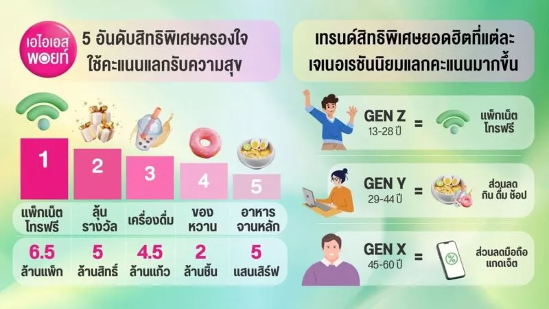 นอกจากนี้ การเปรียบเทียบอัตราการเติบโตของการแลก AIS Points ระหว่างปี 2567 ถึง 2568 พบว่า ลูกค้าในแต่ละเจเนอเรชันมีแนวโน้มการใช้คะแนนที่เติบโตอย่างต่อเนื่อง โดยมีแรงจูงใจในการแลกคะแนนที่แตกต่างกันไปตามไลฟ์สไตล์และความต้องการแต่ละช่วงวัย กลุ่ม Gen X (อายุ 45-60 ปี) มีอัตราการแลกคะแนนเพื่อรับส่วนลดมือถือและอุปกรณ์เสริมเติบโตสูงที่สุด สะท้อนความสนใจในการอัปเกรดอุปกรณ์ให้ทันสมัยอยู่เสมอ กลุ่ม Gen Y (อายุ 29-44 ปี) ใช้คะแนนแลกส่วนลดกิน ดื่ม เที่ยว และช้อปปิ้ง เป็นหลัก ซึ่งสอดคล้องกับไลฟ์สไตล์ที่เน้นการใช้ชีวิตอย่างคุ้มค่า ขณะที่กลุ่ม Gen Z (อายุ 13-28 ปี) มีอัตราการแลกคะแนนเพื่อรับแพ็กเกจอินเทอร์เน็ตและโทรฟรีเพิ่มขึ้นสูงสุด สะท้อนถึงความต้องการในการเชื่อมต่อโลกดิจิทัลตลอดเวลา ดังนั้น เพื่อตอบโจทย์ความต้องการของลูกค้าทุกกลุ่มอย่างตรงใจและครบครันที่สุด จึงเป็นที่มาของการยกระดับ AIS Points ด้วยกลยุทธ์ “ทุกพอยท์ มีพลัง” ที่ออกแบบมาเพื่อรองรับไลฟ์สไตล์ที่หลากหลาย เติมเต็มทุกการใช้คะแนนให้มีคุณค่ายิ่งขึ้นในทุกมิติ