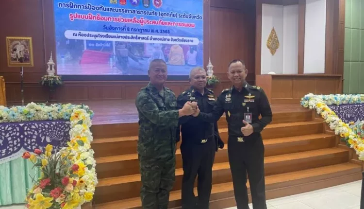 เวลา 09.00 น.วันที่ 8 กรกฎาคม 2568 ที่ ห้องประชุมโรงเรียนแม่สายประสิทธิ์ศาสตร์ อำเภอแม่สาย จังหวัดเชียงราย ได้เปิดการฝึกการป้องกันและบรรเทาสาธารณภัย (อุทกภัย) ระดับจังหวัด โดยมีนายชรินทร์ ทองสุข ผู้ว่าราชการจังหวัดเชียงราย เป็นประธานเปิดกิจกรรม พร้อมด้วย พลโท สิรภพ ศุภวานิช เจ้ากรมทหารช่าง พลตรี วรเทพ บุญญะ รองแม่ทัพภาคที่ 3 พลตรี จักรวีร์ เสนีย์วรยุทธ์ ผู้บัญชาการมณฑลทหารบกที่ 37 จากนักเรียนเตรียมทหารรุ่นที่ 26 ผศ.ดร.นาวิน พรมใจสา รองอธิการบดี มร.ชร. และ ผอ.ศูนย์เฝ้าระวังฯ เพื่อนพึ่ง (ภาฯ) และผู้แทนจากหน่วยงานภาครัฐ ภาคเอกชน หน่วยทหาร อาสาสมัคร รวมถึงประชาชนในพื้นที่กว่า 400 คน เข้าร่วม