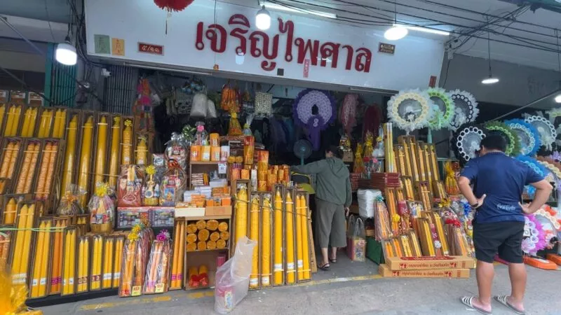 ด้านนางตวงพร เจริญไพศาล อายุ 68 ปี เจ้าของร้านเจริญไพศาล ขอนแก่น กล่าวว่า ปีที่แล้วการค้าขายดีกว่านี้ปีนี้ถนนโล่งทุกทีช่วงนี้คนจอดรถซื้อดอกไม้เครื่อสังฆทานเต็มไปหมดปีนี้เงียบๆ เข้าพรรษามีการเตรียมเทียนพรรษาเพิ่มเล็กน้อย สังฆทานที่ร้านจัดเองไม่ได้ไปรับมาจะมีแต่ของดีๆไม่มีของหมดอายุแน่นอน เริ่มต้นขายชุดละ 150 บาท จัดแบบของที่ได้ใช้จริงได้ประโยชน์ทั้งผู้ให้และผู้รับได้บุญเต็มๆ สำหรับเทียนพรรษาเริ่มต้นที่คู่ละ 80-3,000 บาท มีทั้งแบบเรียบและแกะสลัก ผ้าอาบน้ำฝนเริ่มต้น 80 บาท
