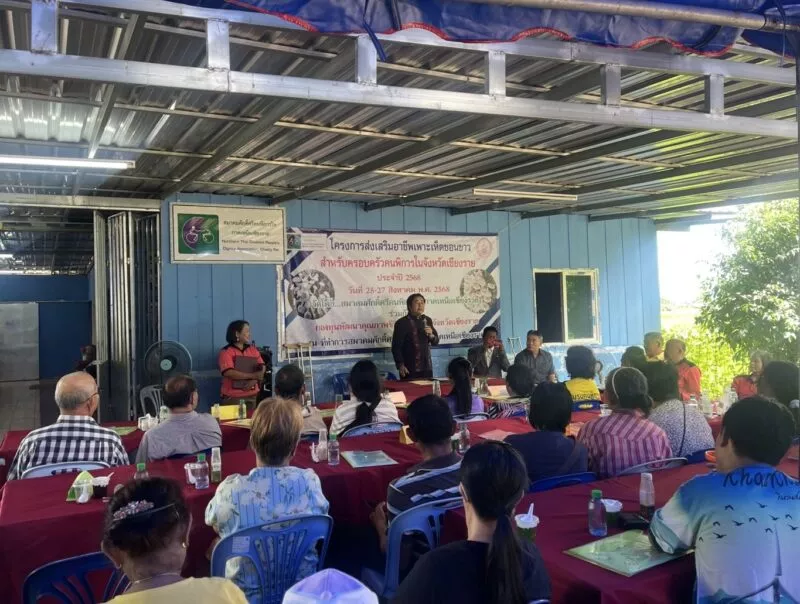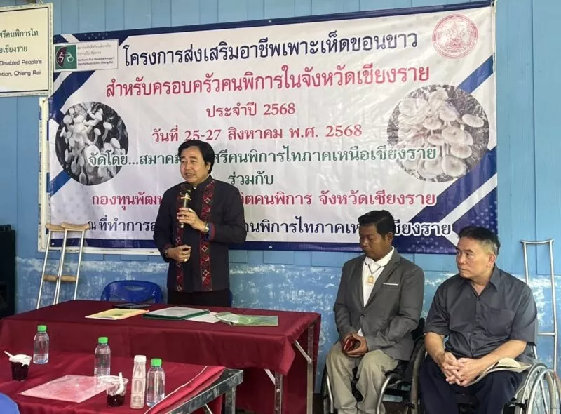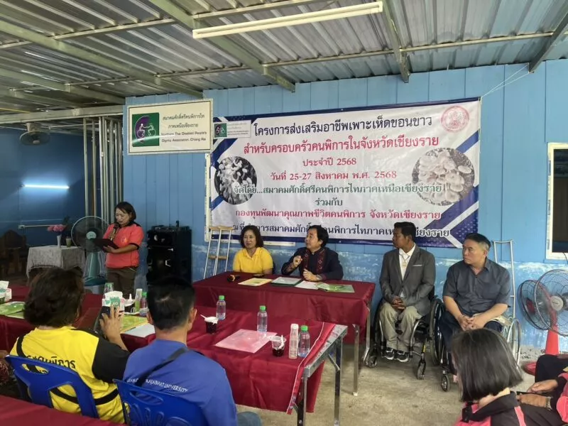 วันจันทร์ที่ 25 สิงหาคม 2568 นายวินัย เก่งสุวรรณ พัฒนาสังคมและความมั่นคงของมนุษย์จังหวัดเชียงราย เป็นประธานเปิดโครงการส่งเสริมอาชีพเพาะเห็ดขอนขาวสำหรับครอบครัวคนพิการในจังหวัดเชียงราย ประจำปี 2568 จัดโดย สมาคมศักดิ์ศรีคนพิการไทภาคเหนือเชียงราย มีวัตถุประสงค์เพื่อลดรายจ่าย สร้างรายรายได้และส่งเสริมอาชีพการเพาะเห็ดขอนขาวให้กับครอบครัวคนพิการ รวมถึงการสนับสนุนการสร้างเครือข่ายกลุ่มอาชีพให้กับครอบครัวคนพิการ โดยมีผู้เข้าร่วมโครงการ เป็นกลุ่มตัวแทนคนพิการ จำนวน 6 อำเภอ อำเภอละ 5 คน ณ สมาคมศักดิ์ศรีคนพิการไทภาคเหนือเชียงราย ตำบลป่าก่อดำ อำเภอแม่ลาว จังหวัดเชียงราย