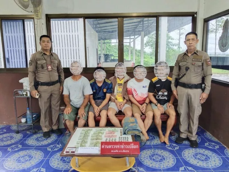 เมื่อไปถึงพบชายจำนวน 5 คน กำลังล้อมวงเล่นไพ่เก้าเกอยู่ เจ้าหน้าที่จึงได้แสดงตัวและเข้าทำการจับกุม ทราบชื่อผู้ต้องหาคือ นายชาญชัย สงวนนามสกุล อายุ 26 ปี ชาว ตำบลท่าข้าม อำเภอเวียงแก่น จังหวัดเชียงราย, นายเล่า สงวนนามสกุล อายุ 33 ปี ชาว ตำบลปอ อำเภอเวียงแก่น จังหวัดเชียงราย, นายชาย สงวนนามสกุล อายุ 24 ปี ชาว ตำบลปอ อำเภอเวียงแก่น จังหวัดเชียงราย, นายว่าง สงวนนามสกุล อายุ 32 ปี ชาว ตำบลปอ อำเภอเวียงแก่น จังหวัดเชียงราย และ Mr. U Htoo อายุ 56 ปี สัญชาติเมียนมา