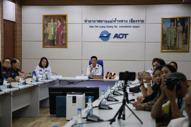 วันพฤหัสบดี ที่ 2 ตุลาคม 2568 เวลา 11.00 น. นาวาอากาศเอก สกรรจ์ อุดล รักษาการผู้อำนวยการท่าอากาศยานแม่ฟ้าหลวง เชียงราย พร้อมด้วย นางแสงเดือน อ้องแสนคำ รองผู้อำนวยการท่าอากาศยานแม่ฟ้าหลวง เชียงราย (ด้านสนับสนุนธุรกิจ) และ ดร.สิทธิปัฐพ์ มงคลอภิบาลกุล รองผู้อำนวยการท่าอากาศยานแม่ฟ้าหลวง เชียงราย (ด้านปฏิบัติการและบำรุงรักษา) ร่วมแถลงข่าวครบรอบการดำเนินงาน 27 ปี ณ ห้องประชุมตอบแทนคุณแผ่นดิน