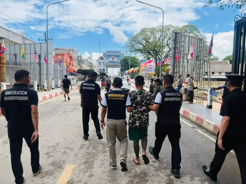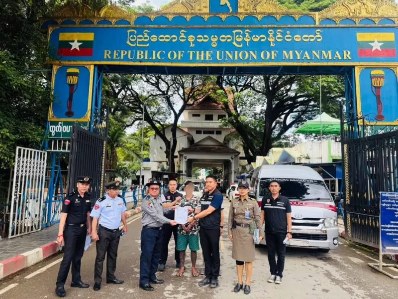 วันที่ 2 ต.ค.2568 พล.ต.ต.สราวุธ คนใหญ่ ผบก.ตม.5,พ.ต.อ.สุรศักดิ์ เทียนทอง ผกก.ตม. จว.เชียงราย,พ.ต.อ.ทิวาพงษ์ พลูโต ผกก.2 บก.ปส.3 นำกำลังเจ้าหน้าที่ตำรวจตรวจคนเข้าเมือง (ตม.) จับกุมตัวนายวีระชิต อายุ 30 ปี ชาว ต.บางแม่นาง อ.บางใหญ่ จ.นนทบุรี หลังจากวันเดียวกันได้รับการประสานจากด่าน ตม.จ.จว.ท่าขี้เหล็ก ประเทศเมียนมา ว่าได้มีบุคคลที่ต้องโทษในประเทศเมียนมา พ้นโทษและคดีสิ้นสุดแล้ว จึงขอให้เจ้าหน้าที่ ตม.จว. เชียงราย รับตัวกลับประเทศไทยผ่านทางจุดผ่านแดนถาวรสะพานมิตรภาพไทย-เมียนมา ข้ามแม่น้ำสายแห่งที่ 1 เชื่อม จ.ท่าขี้เหล็ก กับ อ.แม่สาย จ.เชียงราย