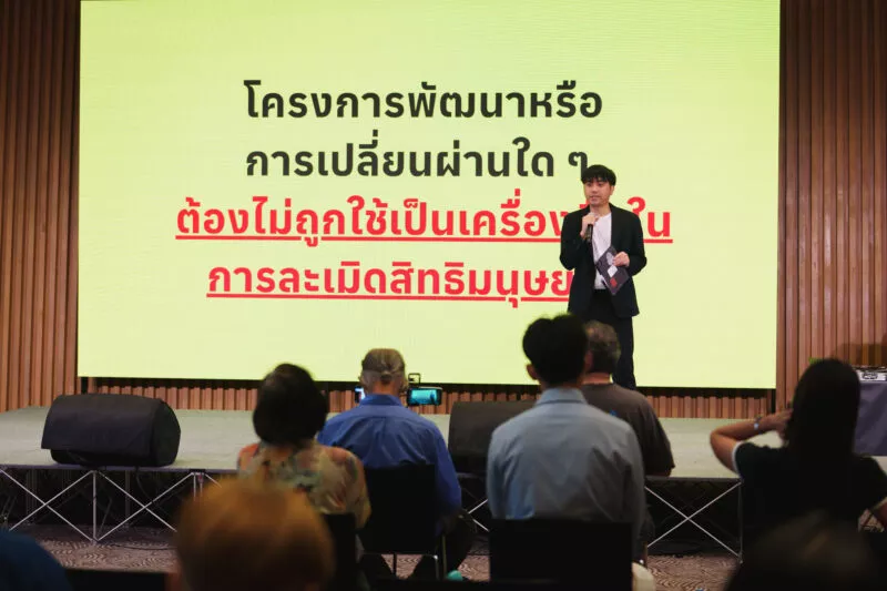 แน่นอนว่าเรื่องทั้งหมดไม่ได้ถูกกล่าวอ้างอย่างเลื่อนลอย ในช่วงสุดท้ายของวงคุยของเวทีเสวนาบ้านใหม่ใกล้ฉันฯ มีผู้ที่เป็นประจักษ์พยาน หรือผู้ที่เผชิญกับความเสี่ยงในการไล่รื้อที่อยู่อาศัย นำคุยโดย ‘ธนกฤต โต้งฟ้า’ ผู้ประสานฝ่ายงานรณรงค์เอิร์ธไรท์ อินเตอร์เนชันแนล พูดถึงกรณีอย่างเหมืองแร่ในภาคเหนือ จังหวัดแม่ฮ่องสอน คาร์บอนเครดิตที่จังหวัดภูเก็ต และแลนด์บริดจ์ที่กำลังก่อสร้างอยู่