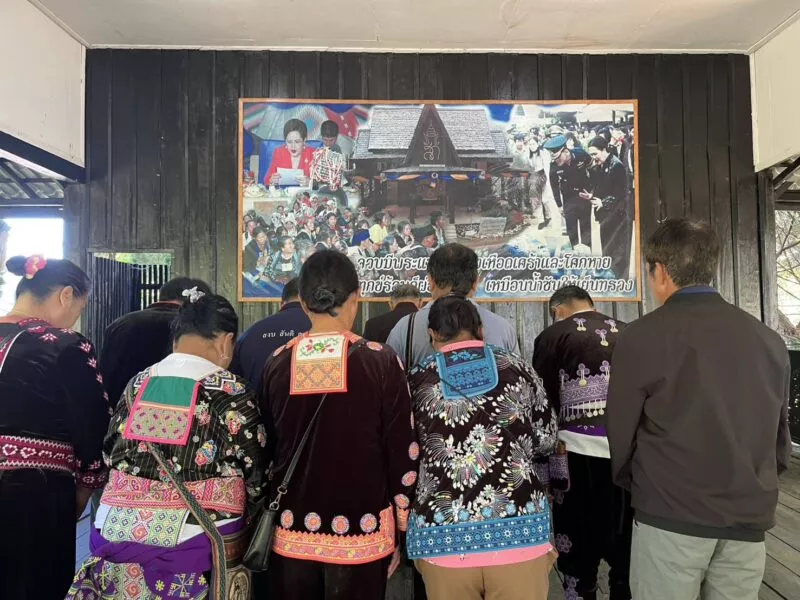 หลังจากที่ชาวบ้านได้ถวายความเคารพพระฉายาลักษณ์ในพลับพลาทรงงานแล้ว นายทูลสวัสด์ ยอดมณีบรรพต หรือ หมอแดง ได้เผยกับผู้สื่อข่าวว่า สถานที่แห่งนี้คือพลับพลาทรงงาน ซึ่งเป็นสถานที่ที่ใช้รับเสด็จสมเด็จพระพันปีหลวง โดยหลังจากสิ้นสุดสงครามคอมมิวนิสต์เมื่อเดือน ก.พ. 2525 ก็ได้มีการสร้างพลับพลาทรงงานขึ้นมาเมื่อปี 2535 จากนั้นได้ถูกใช้เป็นสถานที่รับเสด็จตั้งแต่ปี 2536 โดยสมเด็จพระพันปีหลวงท่านได้เคยเสด็จมาที่นี่ 11 ครั้ง โดยครั้งสุดท้ายเสด็จมาเมื่อปี 2549 และตลอดระยะเวลาที่ท่านมาทรงงานในพื้นก็ได้ส่งเสริมอาชีพจากภูมิปัญญาท้องถิ่น ทั้งงานทอผ้าใยกัญชง การทำเครื่องเงิน งานผ้าปักม้ง ผ้าปักอาข่า ผ้าเขียนเทียน ตลอดจนส่งเสริมการเลี้ยงสัตว์ ทำให้ชาวบ้านมีความเป็นอยู่ดีขึ้น โดยท่านจะตรัสว่า ในหลวง ร.9 ท่านจะส่งเสริมให้มีน้ำ ส่วนท่านจะส่งเสริมให้มีป่า ให้ชาวบ้านปลูกป่า และทำอาชีพเสริมแทนการทำไร่เลื่อนลอย และยังส่งเสริมให้ลูกหลานในพื้นที่เข้าถึงโอกาสทางการศึกษา โดยจะมอบทุนให้เด็กไปเรียนจนจบการศึกษาภาคบังคับ นับเป็นพระมหากรุณาธิคุณกับชาวบ้านในพื้นที่เป็นอย่างมาก