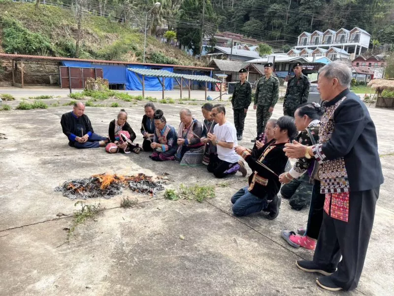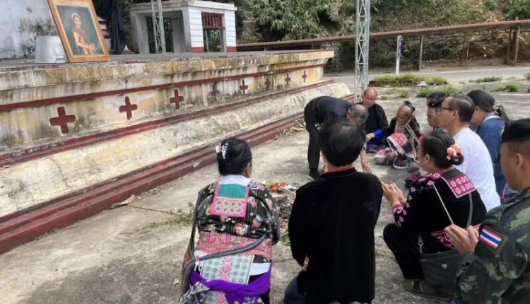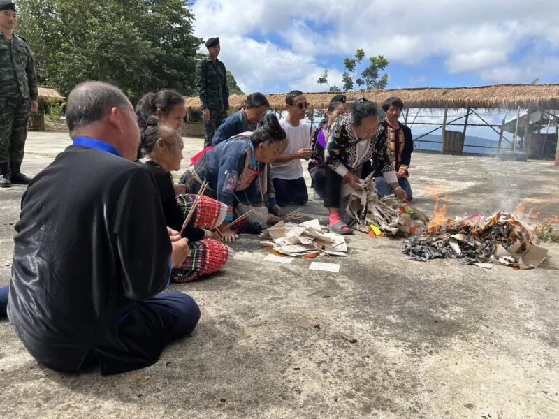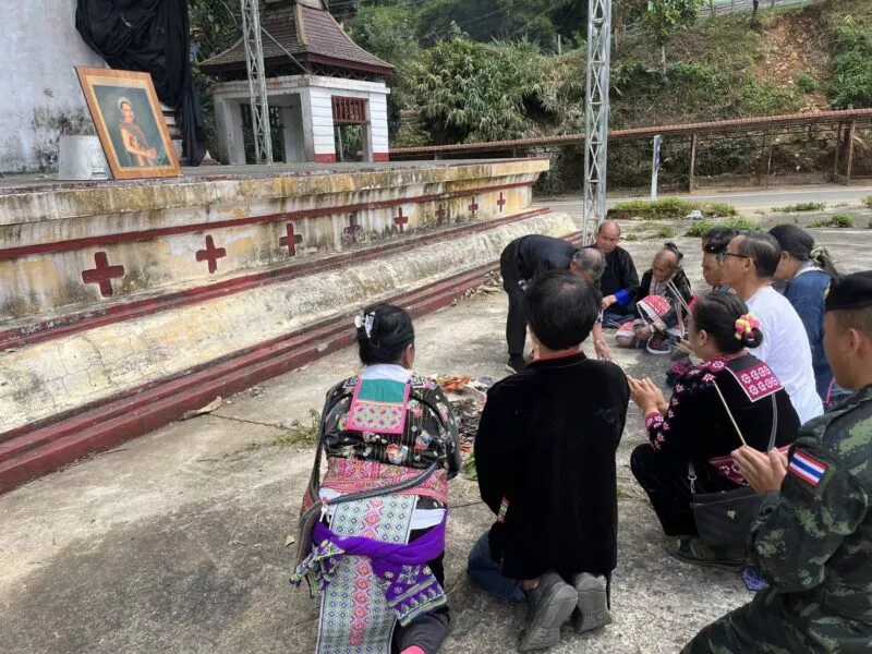 หลังจากการถวายความเคารพพระบรมฉายาลักษณ์แล้ว ชาวบ้านได้เดินทางไปที่ลานกิจกรรมบ้านร่มฟ้าไทย ม.24 ต.ตับเต่า อ.เทิง จ.เชียงราย เพื่อประกอบพิธีเผากระดาษเงินกระดาษทองเพื่อทำบุญถวายเป็นพระราชกุศลแก่สมเด็จพระพันปีหลวงตามความเชื่อของชนเผ่าม้ง โดยมีแกนนำมวลชนในพื้น นางซัว แซ่หาญ แกนนำกลุ่มทอผ้าใยกัญชง ต.ตับเต่า อ.เทิง และนายชิงชัย ยอดมณีบรรพต อดีต ส.อบต.บ้านห้วยหาน ต.ปอ อ.เวียงแก่น พร้อมด้วยชาวบ้านและทหารในโครงการพระราชดำริ ร่วมในกิจกรรมดังกล่าว