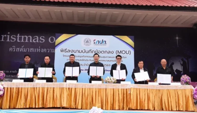 วันที่ 23 ธันวาคม 2568 เทศบาลนครเชียงรายจัดพิธีลงนามบันทึกข้อตกลง (MOU) โครงการสนับสนุนกิจกรรมสร้างเสริมสุขภาพและป้องกันโรค จากกองทุนหลักประกันสุขภาพเทศบาลนครเชียงราย ณ สวนตุงและโคมนครเชียงราย โดยมี นายวันชัย จงสุทธานามณี นายกเทศมนตรีนครเชียงราย เป็นประธานในพิธี พร้อมด้วย นายภาธร์ รังษีกุลพิพัฒน์ และ นางบังอร มะลิดิน รองนายกเทศมนตรีนครเชียงราย ว่าที่ร้อยตรีบุญญฤทธิ์ อายุยืน รองปลัดเทศบาลนครเชียงราย สมาชิกสภาเทศบาลนครเชียงราย คณะกรรมการกองทุนหลักประกันสุขภาพเทศบาลนครเชียงราย คณะกรรมการชุมชน และผู้รับผิดชอบโครงการจากชุมชนในเขตเทศบาลนครเชียงราย เข้าร่วมพิธีอย่างพร้อมเพรียง
