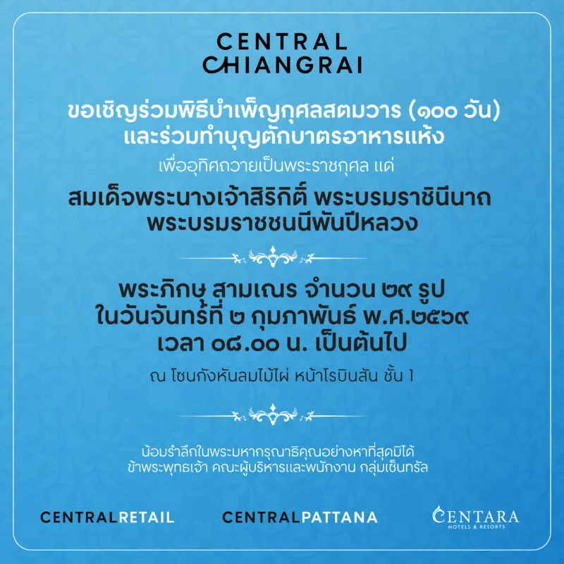 ศูนย์การค้าเซ็นทรัล เชียงราย ขอเชิญร่วมพิธีบำเพ็ญกุศลสตมวาร (100 วัน) และร่วมทำบุญตักบาตรอาหารแห้ง เพื่ออุทิศถวายเป็นพระราชกุศล แด่สมเด็จพระนางเจ้าสิริกิติ์ พระบรมราชินีนาถ พระบรมราชชนนีพันปีหลวง