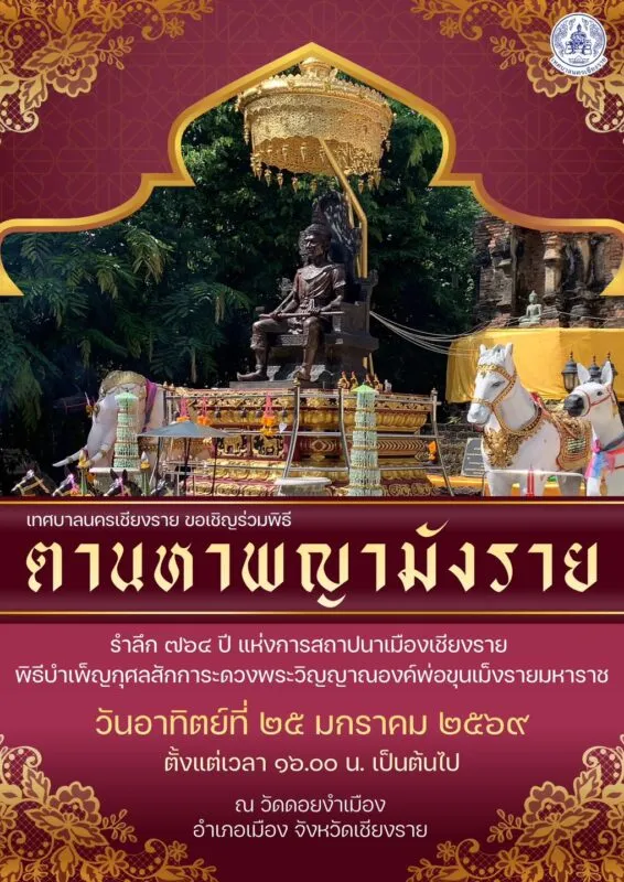 เทศบาลนครเชียงรายโดย นายวันชัย จงสุทธานามณี นายกเทศมนตรีนครเชียงราย ได้สำนึกในพระมหากรุณาธิคุณ จึงได้จัดพิธีบำเพ็ญกุศลสักการะดวงพระวิญญาณพ่อขุนเม็งรายมหาราชขึ้น ในวันที่ ๒๕ มกราคม เวลา ๑๖.๐๐ น. ณ วัดดอยงำเมือง #ขอเชิญชวนพี่น้องชาวเชียงรายและนักท่องเที่ยวร่วมประกอบพิธี