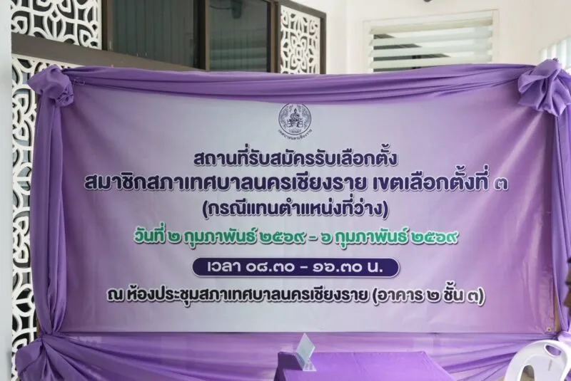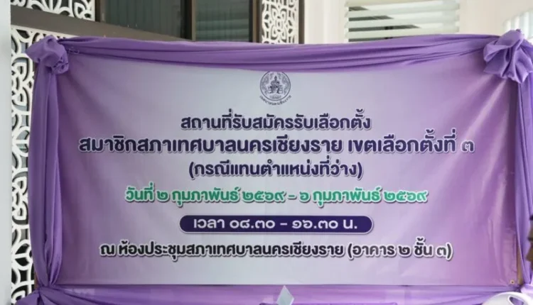 ทั้งนี้ เทศบาลนครเชียงราย เปิดรับสมัครรับเลือกตั้งสมาชิกสภาเทศบาลนครเชียงราย เขตเลือกตั้งที่ 3 (กรณีแทนตำแหน่งที่ว่าง) ไปจนถึงวันศุกร์ที่ 6 กุมภาพันธ์ พ.ศ. 2569 ตั้งแต่เวลา 08.30 – 16.30 น. ในวันและเวลาราชการ เทศบาลนครเชียงราย ขอเชิญชวนผู้ที่มีคุณสมบัติและมีความพร้อม เข้ามามีส่วนร่วมในการพัฒนาท้องถิ่น สมัครรับเลือกตั้งเพื่อทำหน้าที่เป็นตัวแทนของประชาชน และร่วมขับเคลื่อนเทศบาลนครเชียงรายให้ก้าวหน้าอย่างยั่งยืน