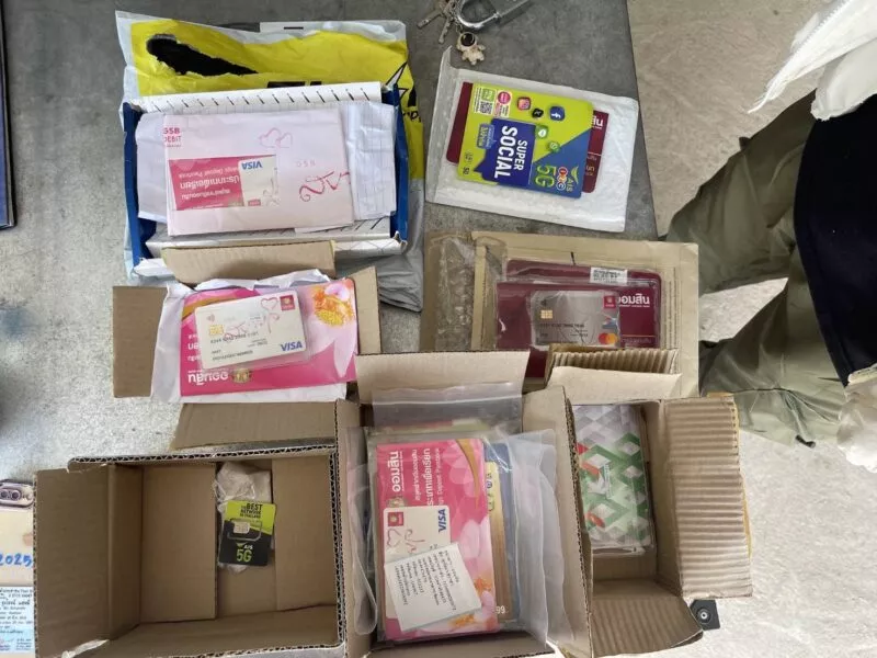 ผลการตรวจสอบโดยละเอียด พบของกลางประกอบด้วย บัญชีธนาคารออมสิน 12 เล่ม บัญชีธนาคารกสิกรไทย 4 เล่ม บัญชีธนาคารกรุงเทพ 1 เล่ม บัตรเอทีเอ็มธนาคารออมสิน 12 บัตร บัตรเอทีเอ็มธนาคารกสิกรไทย 6 บัตร บัตรเอทีเอ็มธนาคารกรุงเทพ 1 บัตร ซิมการ์ดโทรศัพท์มือถือเครือข่าย AIS 20 อัน บรรจุอยู่ในกล่องพัสดุทั้ง 6 กล่องที่ถูกตรวจยึดได้ และตรวจยึดโทรศัพท์มือถือยี่ห้อไอโฟน 8 พลัส ของผู้ต้องหาไว้เพื่อตรวจสอบขยายผล