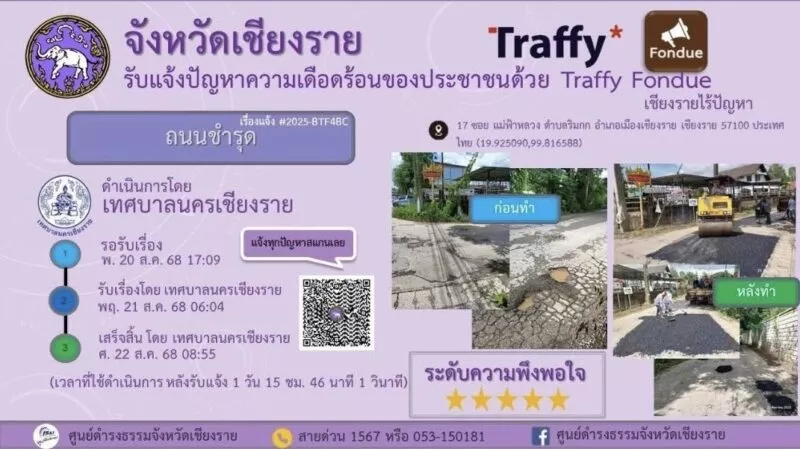 เทศบาลนครเชียงรายโดย นายวันชัย จงสุทธานามณี นายกเทศมนตรีนครเชียงราย กล่าวว่า การนำแอปพลิเคชัน Traffy Fondue มาใช้ ถือเป็นการพัฒนาระบบบริการสาธารณะให้ทันสมัย สอดคล้องกับนโยบาย Smart City ของจังหวัดเชียงราย ที่มุ่งเน้นการใช้เทคโนโลยีเข้ามายกระดับคุณภาพชีวิตของประชาชน พร้อมเชิญชวนพี่น้องประชาชนในเขตเทศบาลดาวน์โหลดและใช้งาน เพื่อให้การแก้ไขปัญหาในพื้นที่เกิดประสิทธิภาพสูงสุด