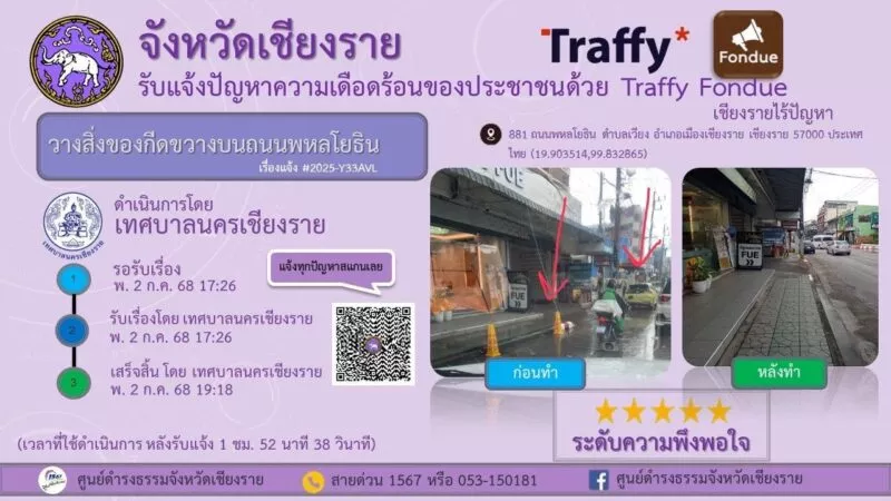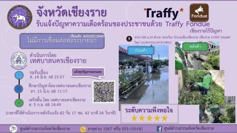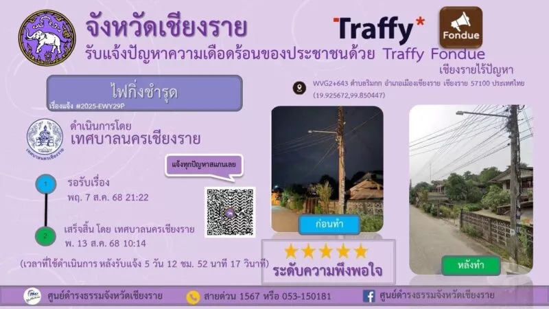“แอปพลิเคชัน Traffy Fondue” เป็นเครื่องมือรับเรื่องร้องเรียน และแจ้งปัญหาจากประชาชนในเขตเทศบาล เพื่อให้การบริการเป็นไปอย่างสะดวก รวดเร็ว และโปร่งใส โดยประชาชนสามารถแจ้งปัญหาที่พบในชีวิตประจำวัน ไม่ว่าจะเป็นเรื่องถนนชำรุด ไฟส่องสว่างชำรุด ขยะมูลฝอย น้ำท่วมขัง ตลอดจนปัญหาอื่น ๆ ผ่านระบบออนไลน์ได้ทันที เมื่อมีการแจ้งเรื่องเข้ามา ระบบจะส่งข้อมูลไปยังหน่วยงานที่เกี่ยวข้องของเทศบาลนครเชียงรายเพื่อดำเนินการแก้ไข พร้อมทั้งสามารถติดตามความคืบหน้าได้อย่างต่อเนื่อง ทำให้การแก้ไขปัญหาเป็นรูปธรรมและตรวจสอบได้จริง