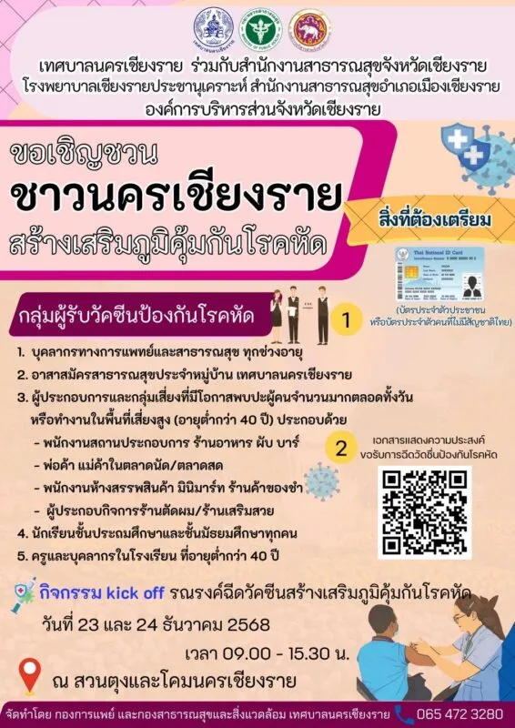 นักเรียน ชั้นประถมศึกษา และชั้นมัธยมศึกษาทุกคน ครูและบุคลากรทางการศึกษา ที่มีอายุต่ำกว่า 40 ปี กิจกรรม Kick Off รณรงค์วัคซีนสร้างเสริมภูมิคุ้มกันโรคหัด วันที่ 23 – 24 ธันวาคม 2568 เวลา 09.00 – 15.30 น. ณ บริเวณด้านหน้าสวนตุงและโคมเทศบาลนครเชียงราย